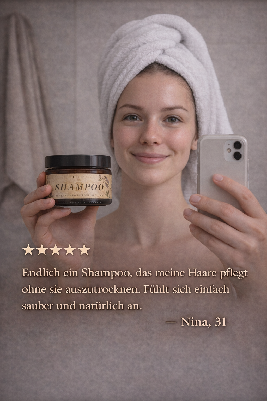 Unser echtes Shampoo reinigt Haar und Kopfhaut sanft und gründlich – ohne das natürliche Gleichgewicht zu stören. Die sorgfältig ausgewählten pflanzlichen Inhaltsstoffe versorgen das Haar mit Feuchtigkeit, stärken die Haarstruktur und schenken ein frisches, gesundes Haargefühl.