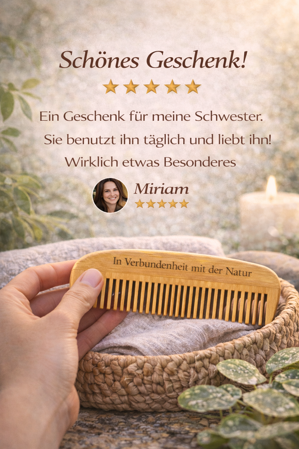 Gefertigt aus reinem Bambus, liegt er warm und leicht in der Hand und gleitet sanft durch dein Haar – ohne Ziepen, ohne statische Aufladung, ohne Kompromisse.